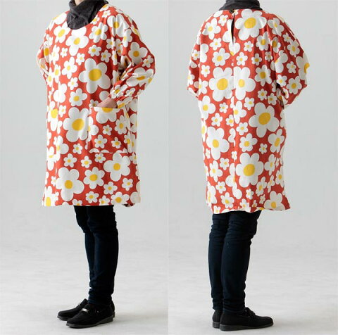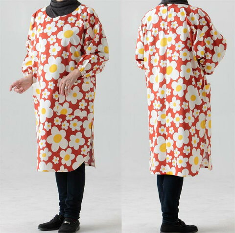 たっぷり ゆったりかっぽう着(割烹着)フリーサイズ丈長丸スリットタイプ627オレンジ花柄生地も縫製も日本製